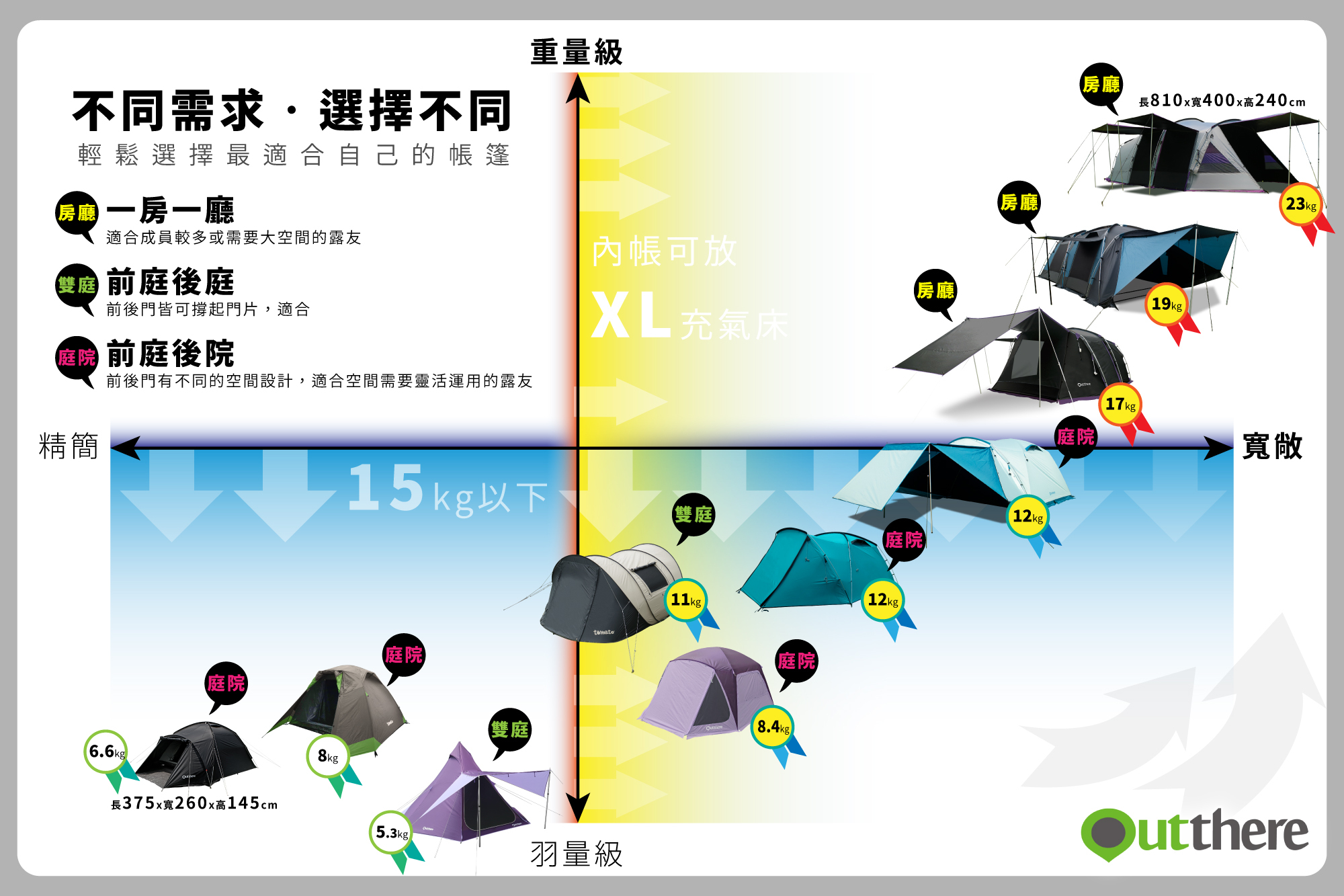 透過圖卡小工具來幫忙,可以輕鬆地從實際使用面進行評估,依照不同的使用需求去選擇就對了!切記,市場上不會有一百分完美的帳篷,但肯定會有一頂適合您的帳篷。
