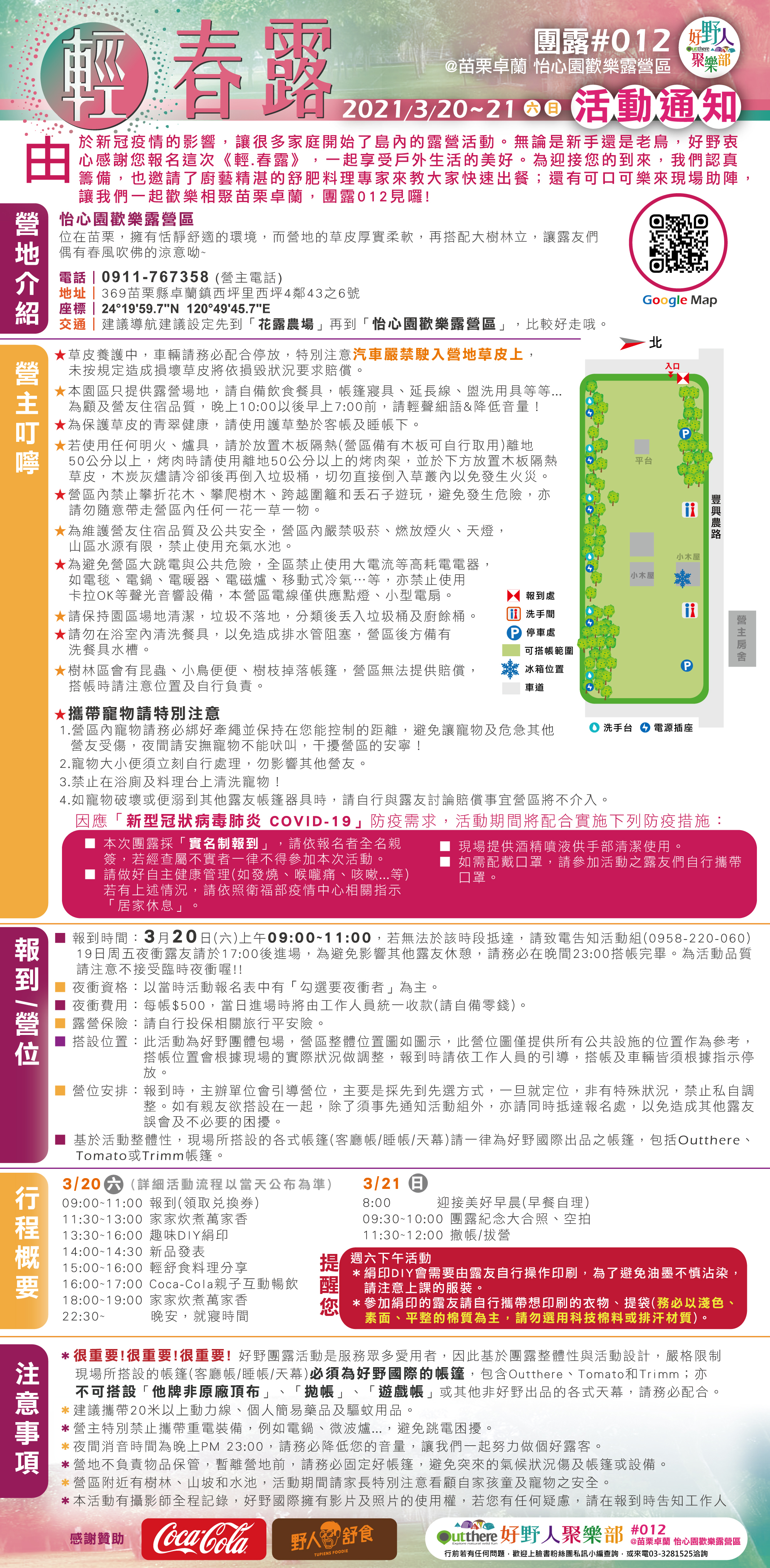 ●夜衝說明:可於2021年03月19日(五) 18:00~21:00進場,夜間搭帳或活動請於 23:00結束。(夜衝清潔費500元,活動當日現場繳費)。