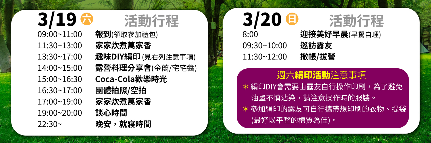 為迎接您的到來,我們認真籌備,也邀請了料理界的老品牌-金蘭小醬贊助「露營料理分享會」;還有可口可樂來現場助陣,讓大家有喝有玩嗨翻天!