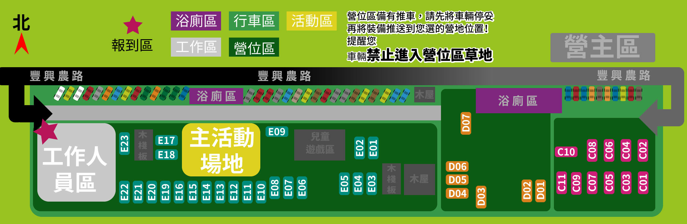 疫情期間謝絕訪客,一帳僅搭配一個車位,當選定營位後,車位比照營位編號停車!