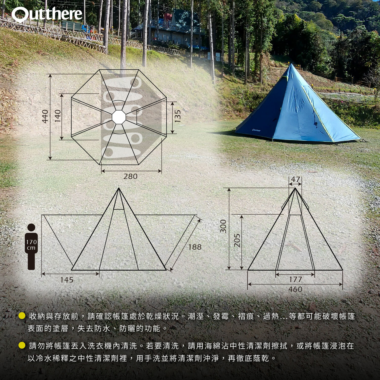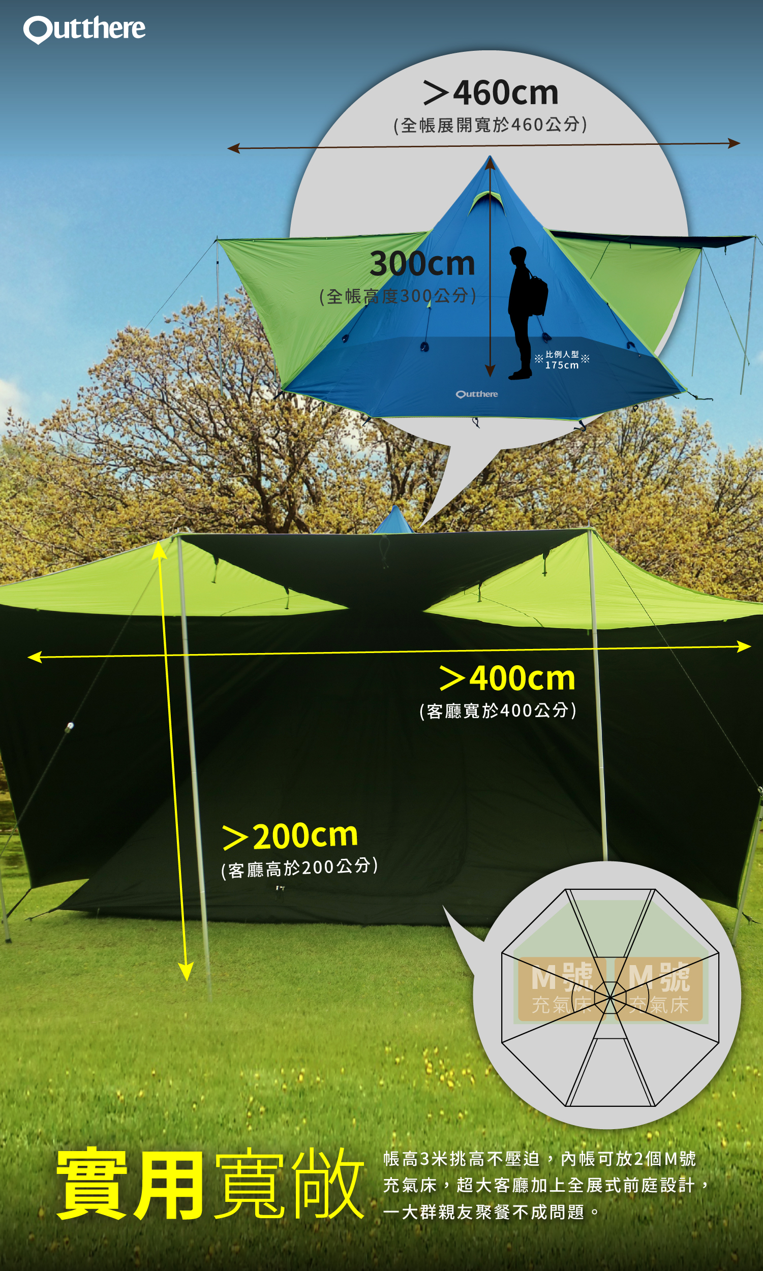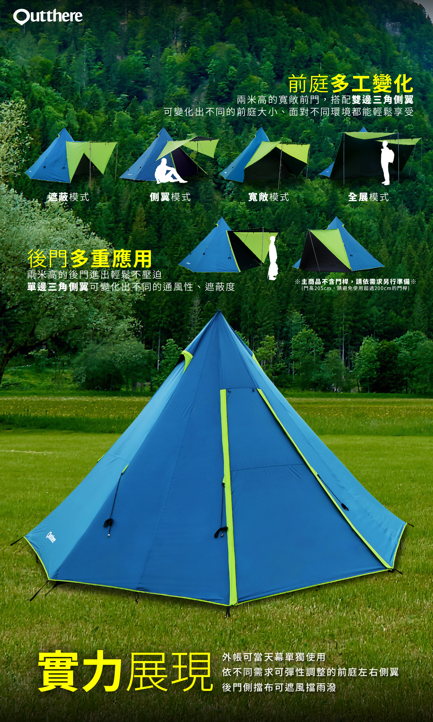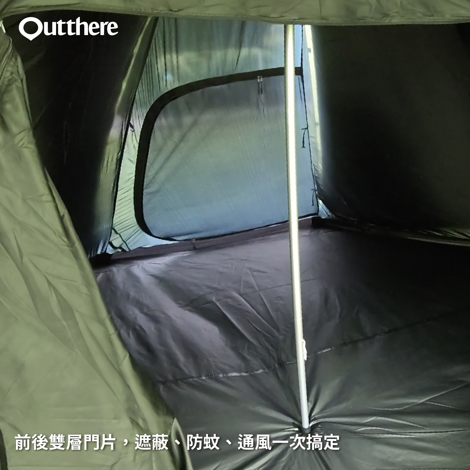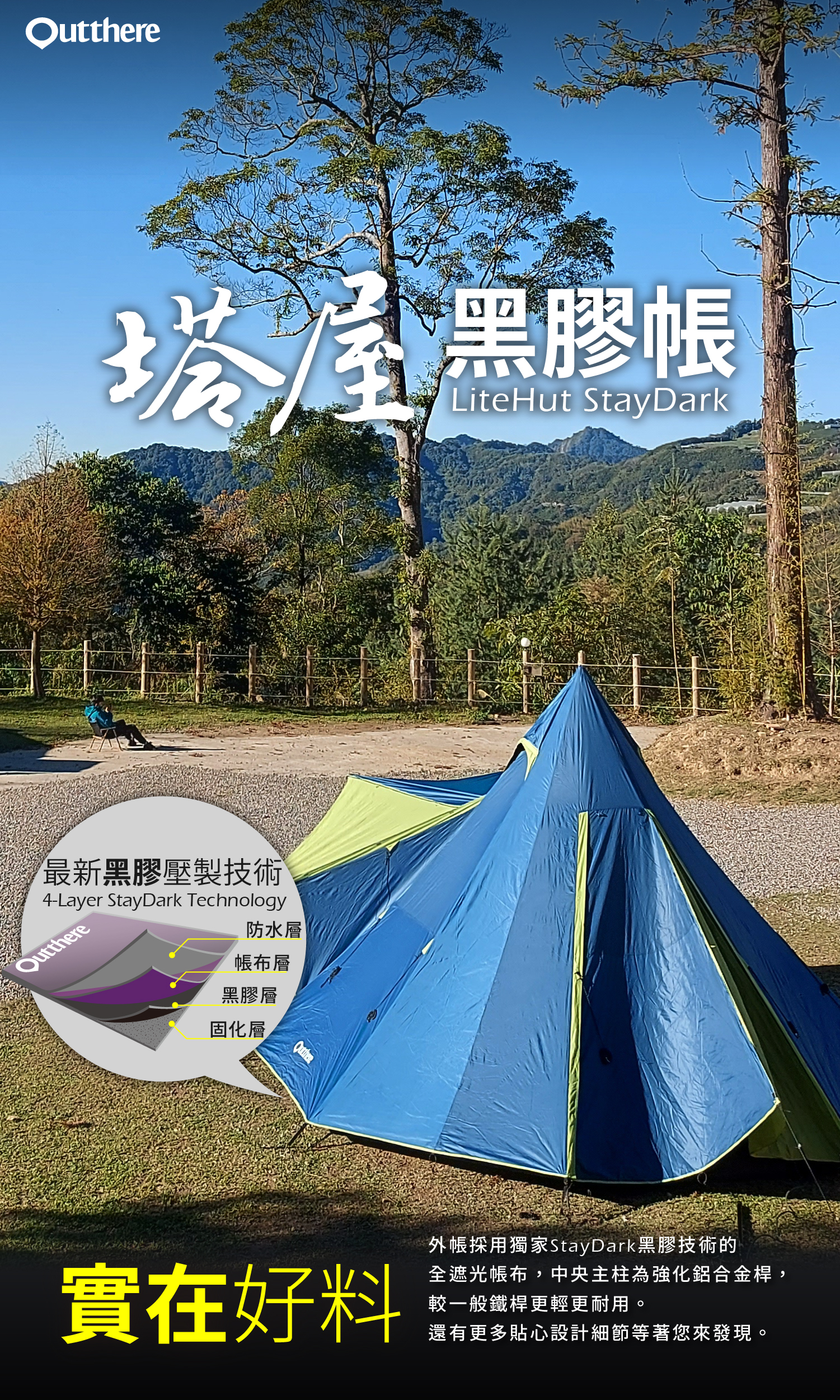 Outthere的塔屋系列,從3人、5人、6人帳進化到黑膠帳,空間加大、功能再提升,讓戶外露營的生活更方便、舒適。與所有塔屋帳篷搭設方式雷同,但此款黑膠帳的帳底是八角造型,除了有寬敞的內帳睡眠區外,還有一個客廳區,是印地安帳篷裡的豪華款式。