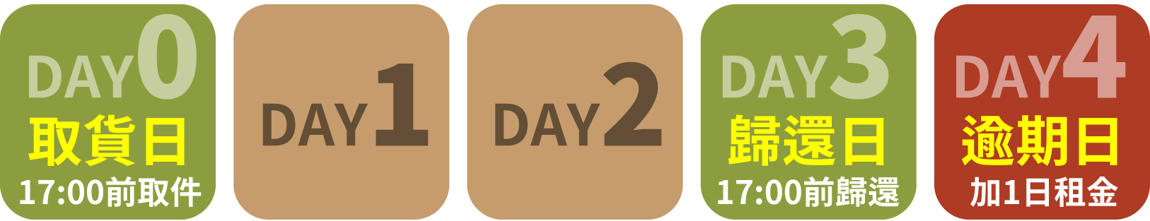舉例(A):取貨日是週五,往後3天內歸還,亦即周一下班前17:00歸還即可,超過17:00則再加1日的租金。