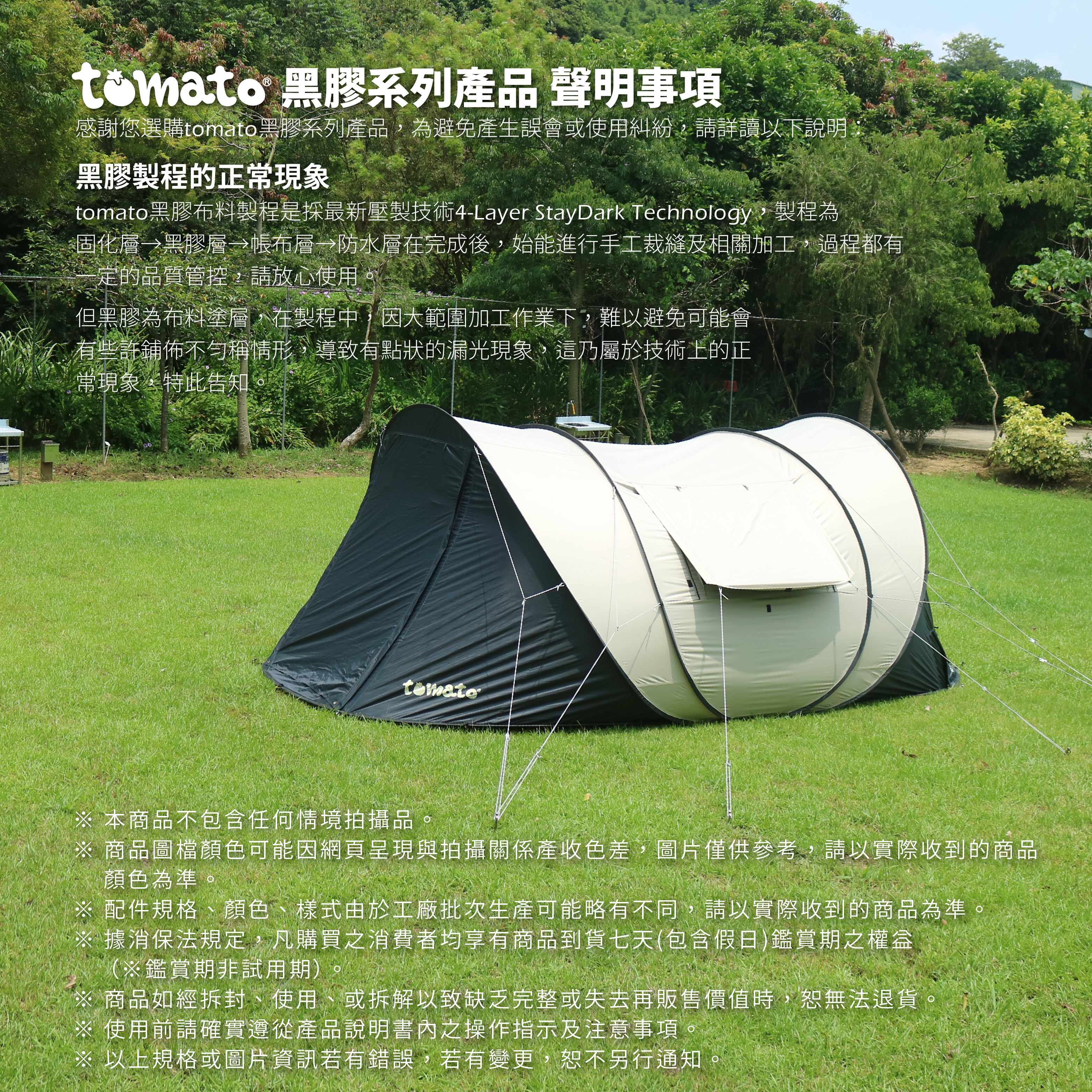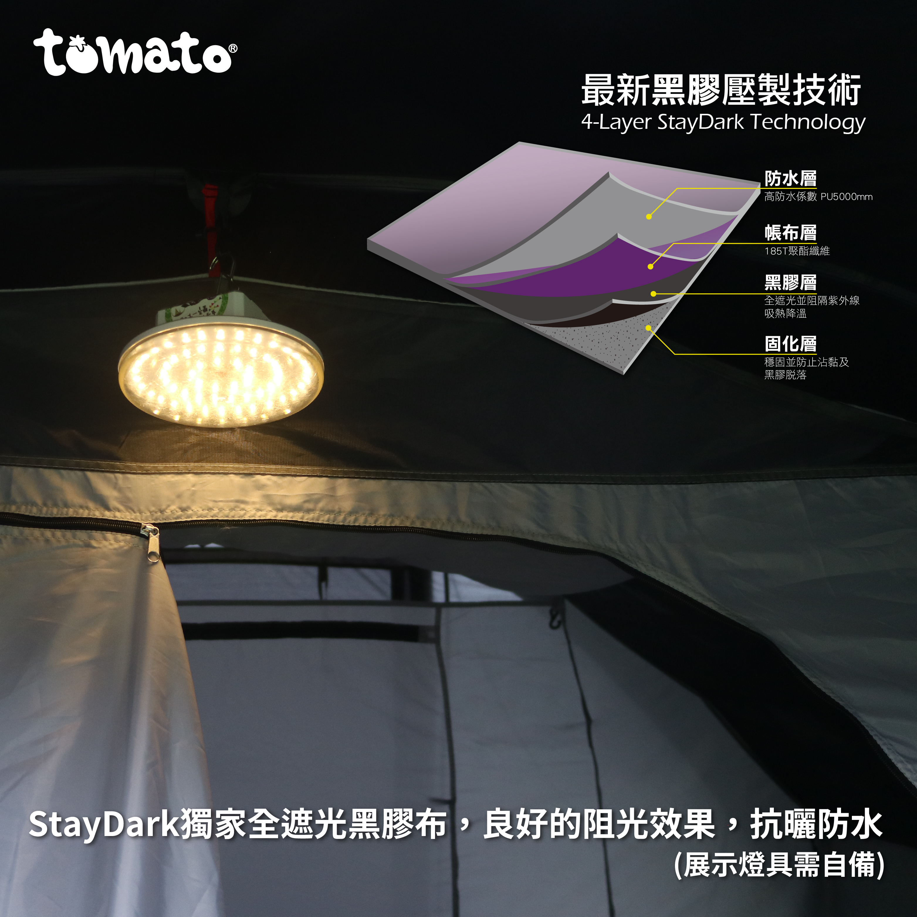 採用StayDark技術的全遮光黑膠布,除了提供黑到不能再黑的高遮光及降溫效果外,超過PU5000mm以上的防水係數,「Tomato番茄速開帳」提供了一般拋帳沒有的舒適感。