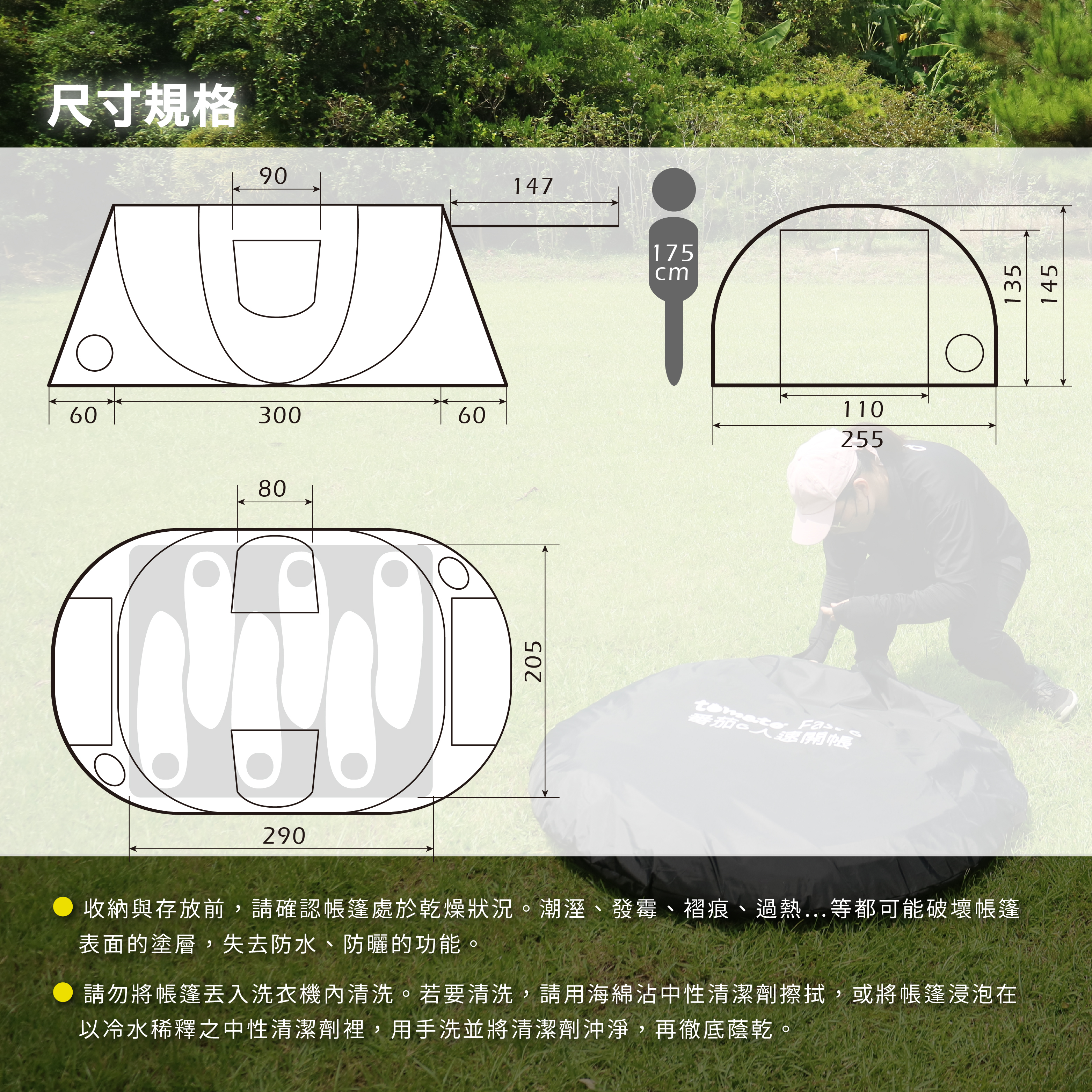 🍅、搭設前請參閱說明書並觀看搭帳教學影片,開帳時請務必清空周邊人員,避免帳篷彈開後,意外造成人員受傷。
