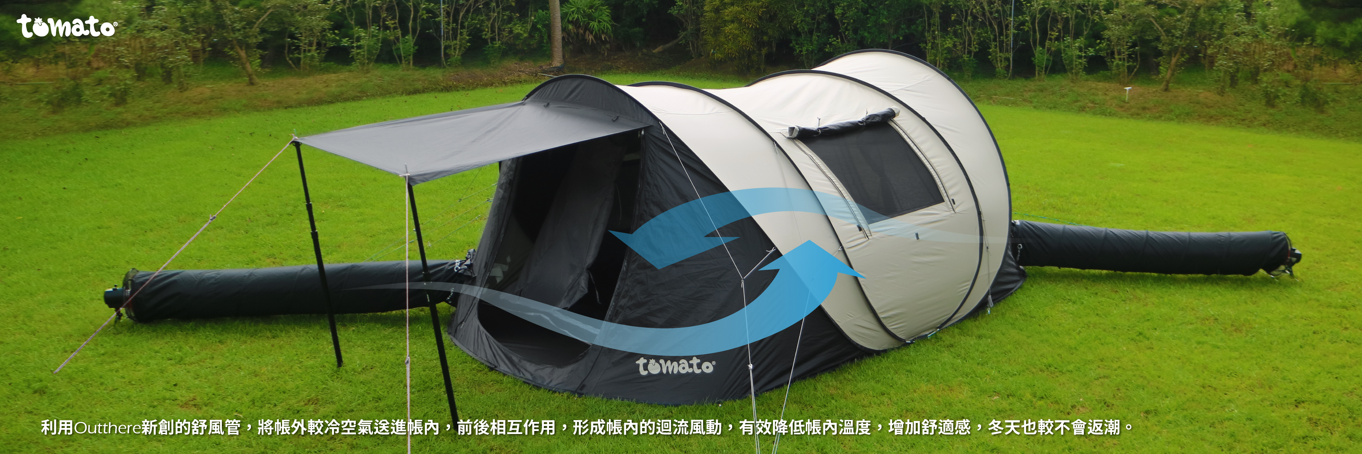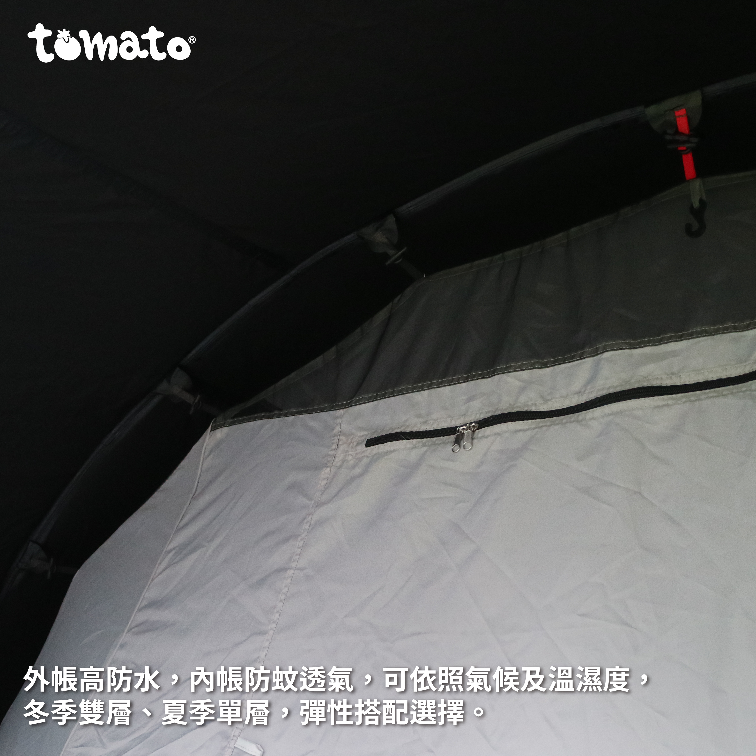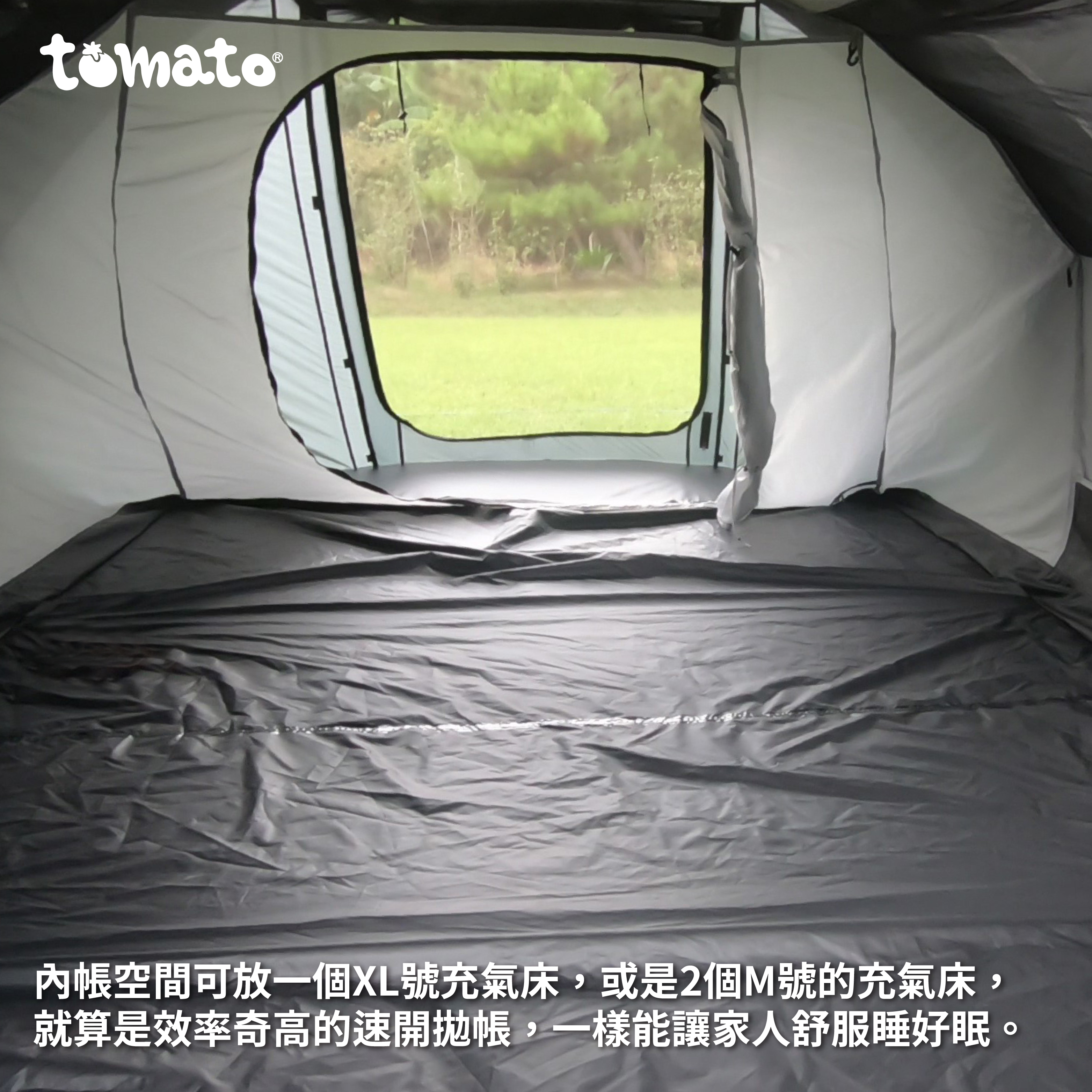 不用再穿骨、不用帶打氣筒,打開「Tomato番茄速開帳」一拋,連內帳都幫您掛上了,一頂帳篷就妥妥地在眼前,露營的時光立馬展開,輕鬆就能開始就能享受野外山林。