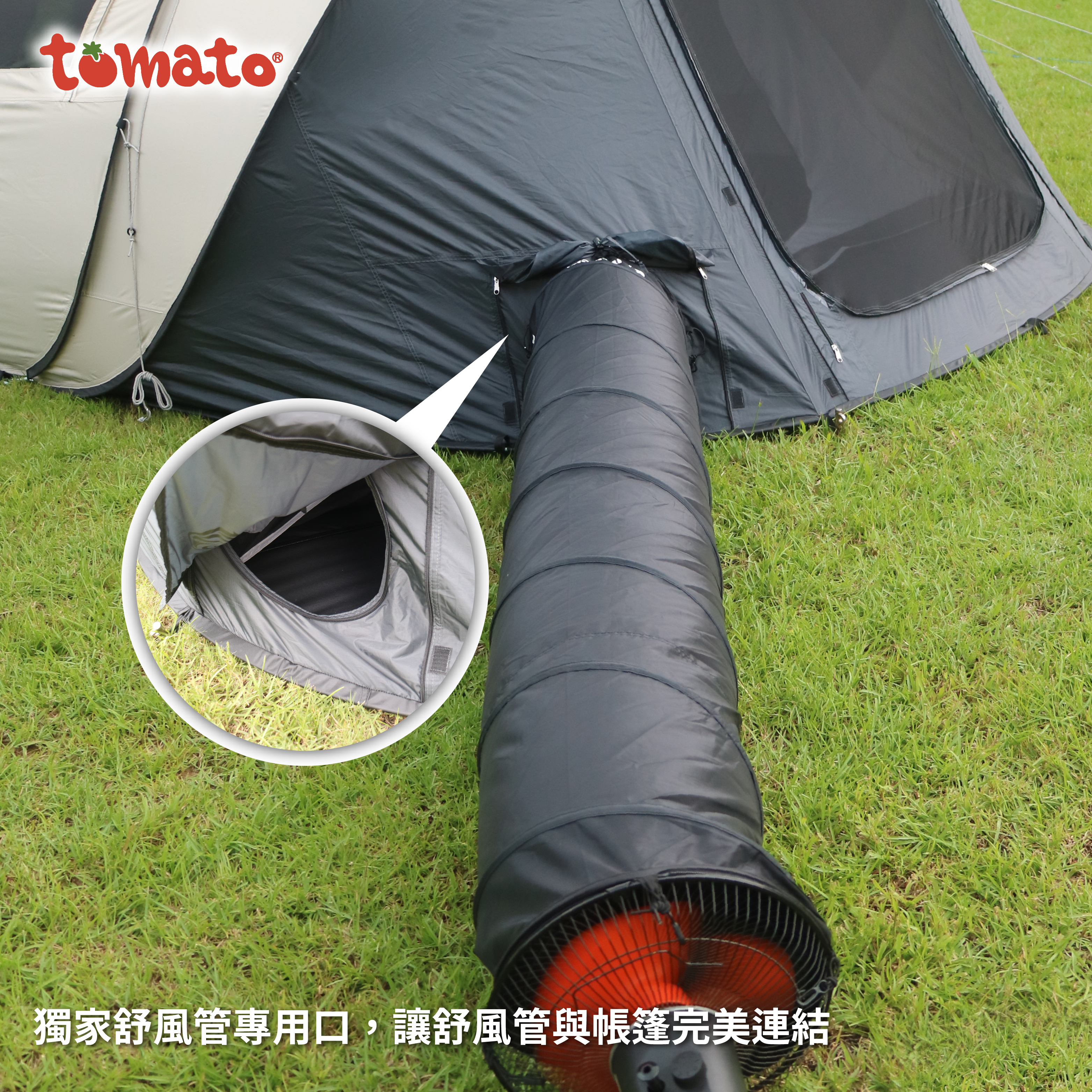 前後門各有一個環形口,可對接Outthere的「舒風管」,這個獨家的「旋風迴流設計」讓黑膠帳篷內部有更佳的對流效果,夏天可降溫、冬天可防返潮。拋帳不再陽春,把舒適功能提升到新的等級。